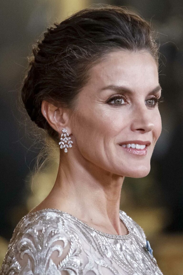 Королева Летиция одета в тюлевое платье, расшитое нитями платинового цвета и цвета шампанского, от аргентинского дизайнера Габриэля Лаге