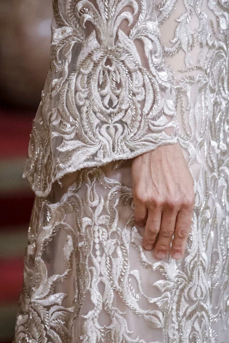 Платье выполнено из тюля, на котором вышиты арабески нитками цвета шампанского и розового цвета. Некоторые узоры украшены платиновым ламинированным принтом, а также вышиты тонкими хрустальными бусинами.Жены эмиров и вообще жены правителей Ближнего Востока также не носят диадемы на государственных банкетах. Возможно, именно по этой причине королева Летиция предпочла не выпускать ни одной из диадем из впечатляющей коллекции, которой владеют Бурбоны.